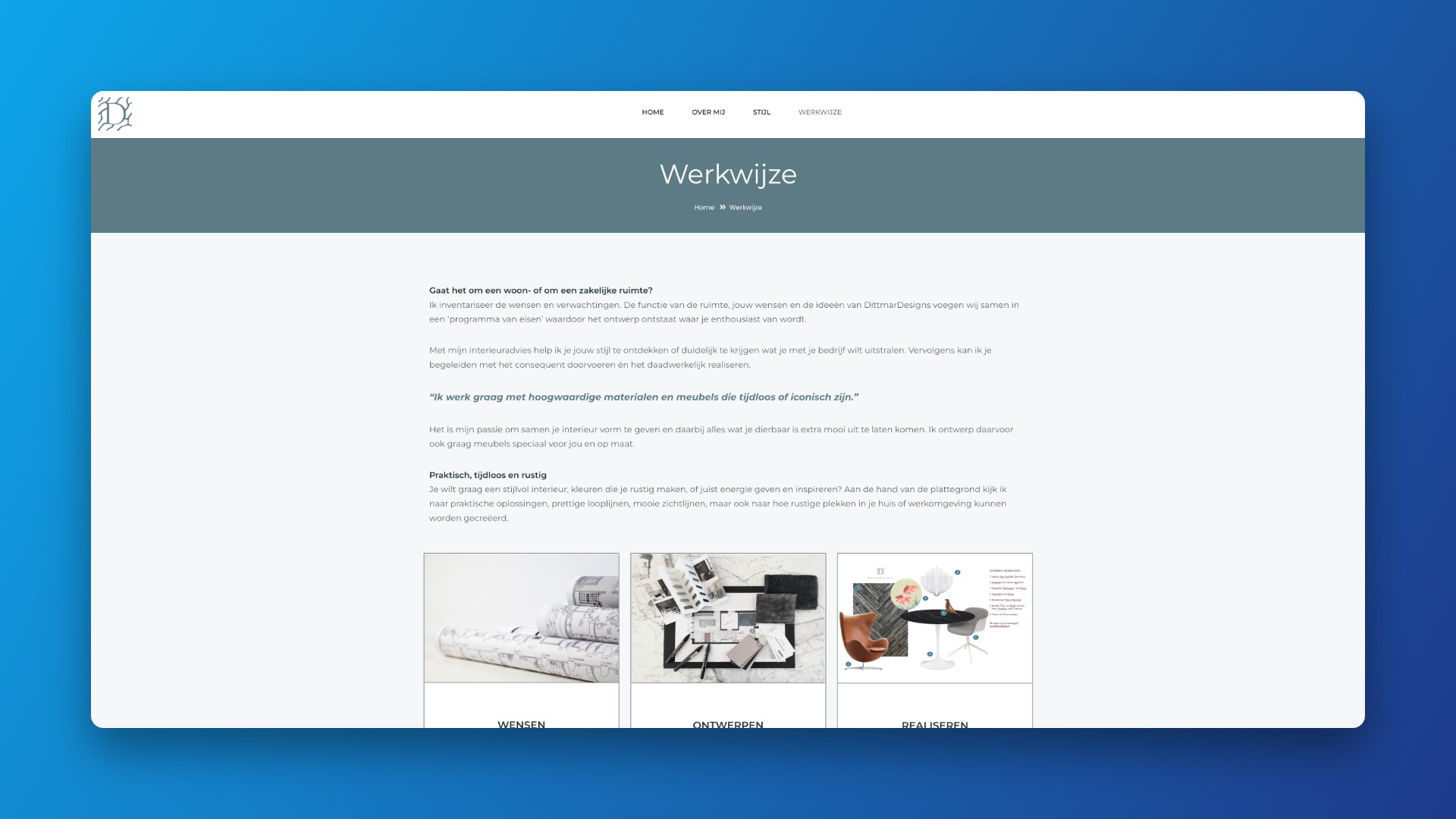 De stijl van de website moest goed uitdragen waar DittmarDesigns voor staat: een doordachte, persoonlijke aanpak met oog voor natuurlijke materialen en een rustige, kwalitatieve uitstraling die past bij het vormgeven van een ideale leefomgeving.