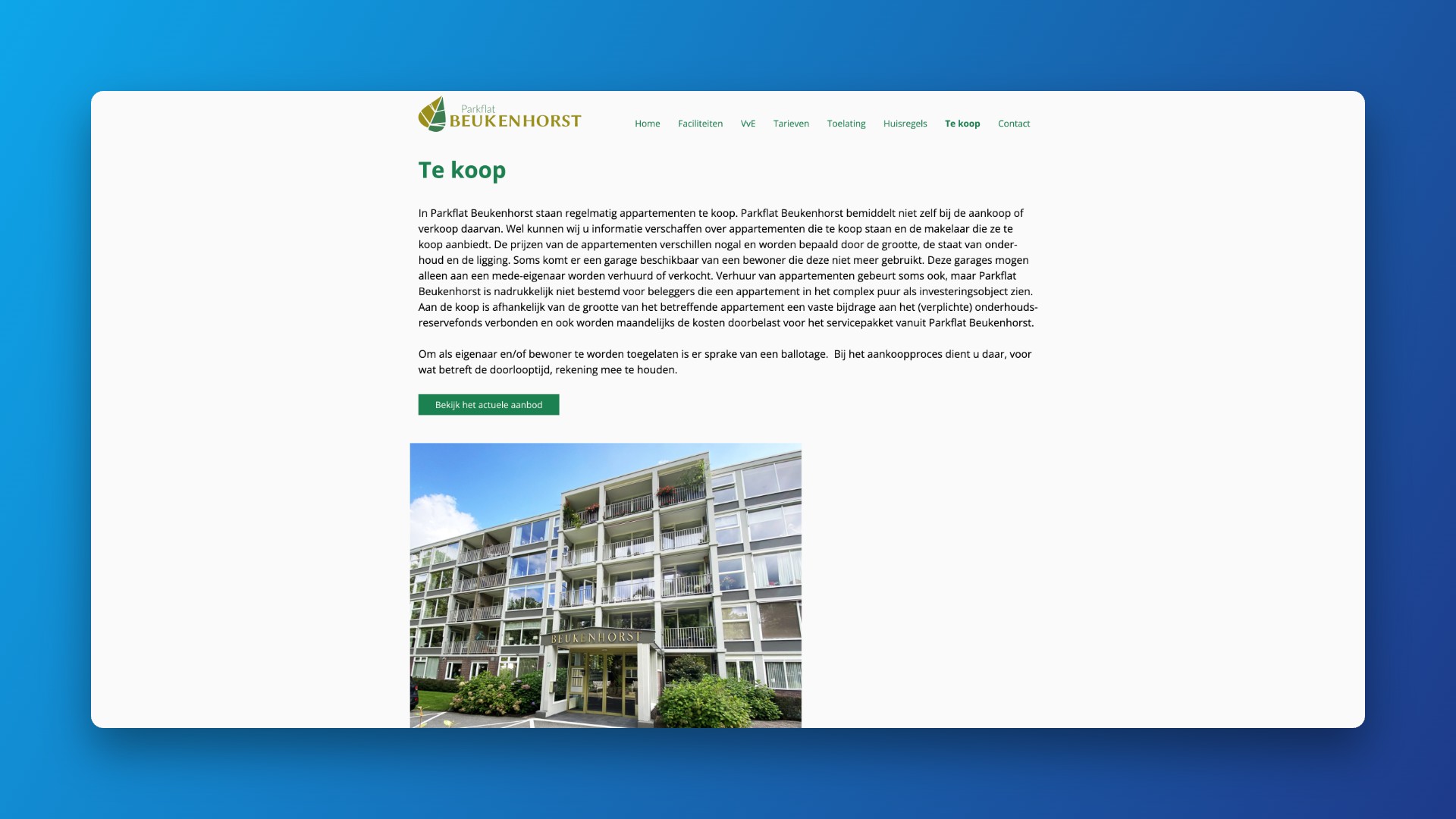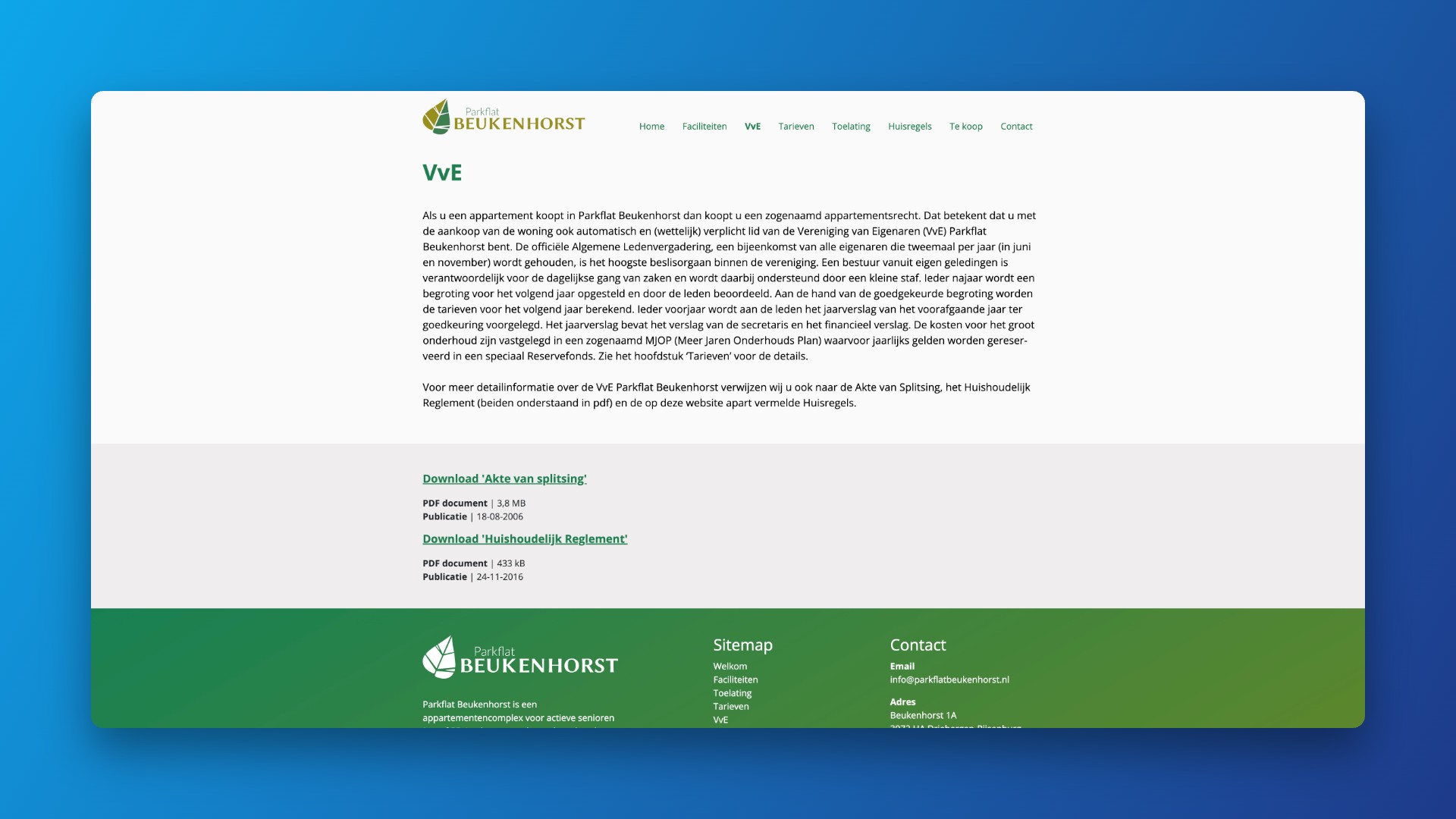 Zorg voor een nieuwe website met een duidelijke structuur: de sfeer en ligging van het complex, informatie over faciliteiten en diensten, tarieven, VvE‑documenten, toelating en huisregels, en een plek voor appartementen die te koop staan. De site moest professioneel en rustig ogen – passend bij de leefomgeving en bewoners van Beukenhorst.