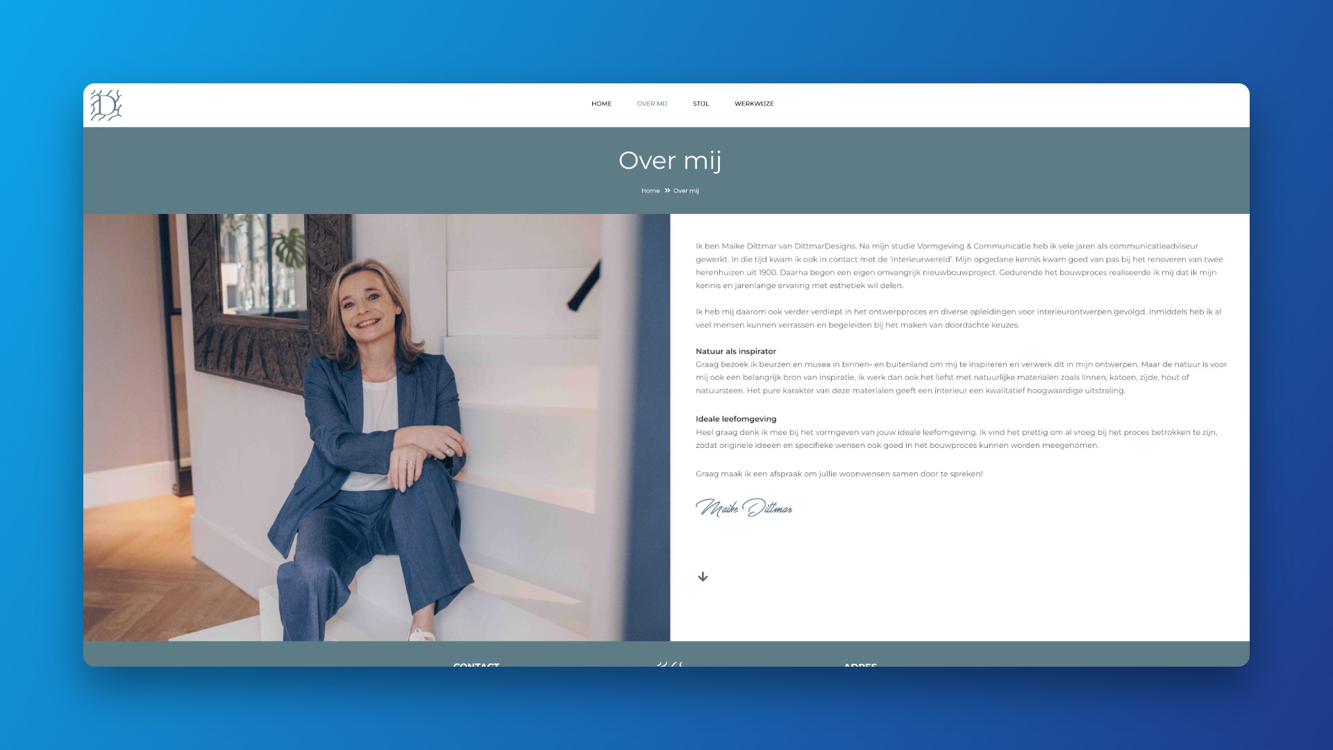 De stijl van de website moest goed uitdragen waar DittmarDesigns voor staat: een doordachte, persoonlijke aanpak met oog voor natuurlijke materialen en een rustige, kwalitatieve uitstraling die past bij het vormgeven van een ideale leefomgeving.