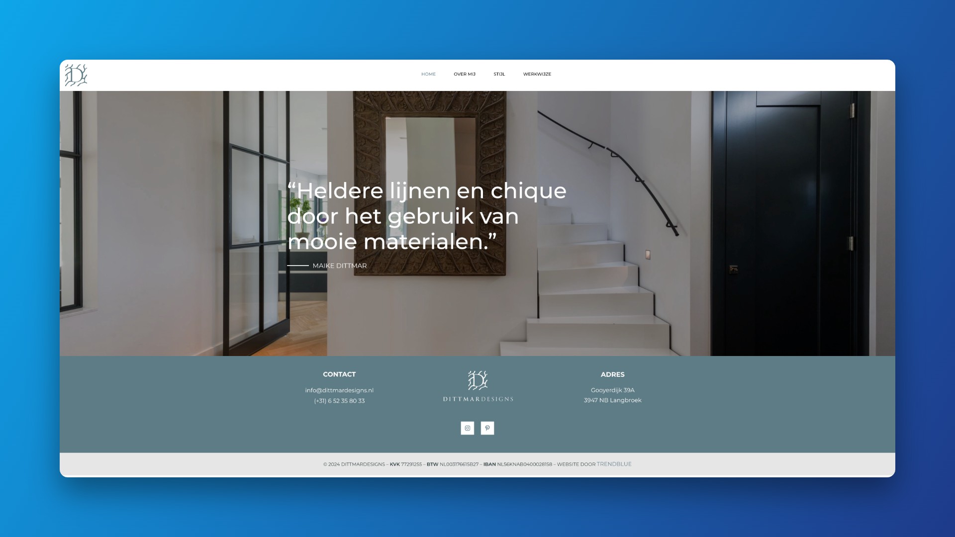 DittmarDesigns is een interieurstudio met een eigen stijl en persoonlijke aanpak. De website moest vooral een digitaal visitekaartje zijn: rustig, overzichtelijk en passend bij de projecten en werkwijze van de studio.