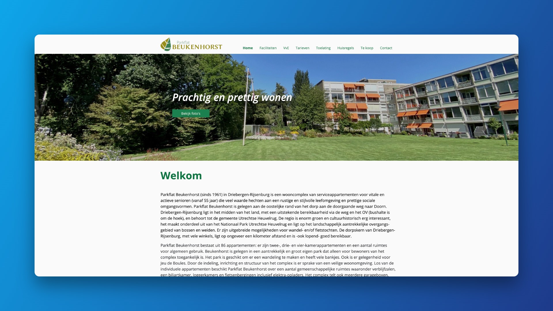 Parkflat Beukenhorst is een wooncomplex van 86 serviceappartementen voor actieve senioren (55+) in Driebergen-Rijsenburg. Het complex ligt aan de rand van het dorp, midden in het groen, met een eigen park dat uitsluitend voor bewoners toegankelijk is. De VvE wilde een website die het complex goed introduceert en alle informatie voor (toekomstige) bewoners en geïnteresseerden overzichtelijk bundelt.